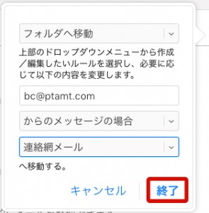 「フォルダへ移動」を選択し、「bc@ptamt.com」からのメッセージの場合、3.で作成したフォルダに移動するように設定し終了をクリックします。